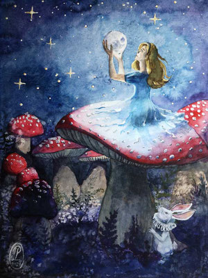 The story of "Alice in Wonderland" inspired me to channel it into my art. By painting individual scenes that didn't happen at all, although they could have, I create paintings that border on illustration and my own conception of the story.
